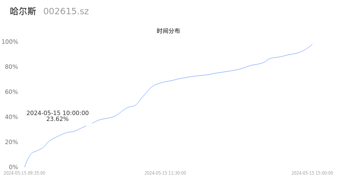 002615哈尔斯2024年05月15日成交38.66万手,成交金额3.17亿元,相较昨日放量6732手,换手率12.72%,成交活跃。
