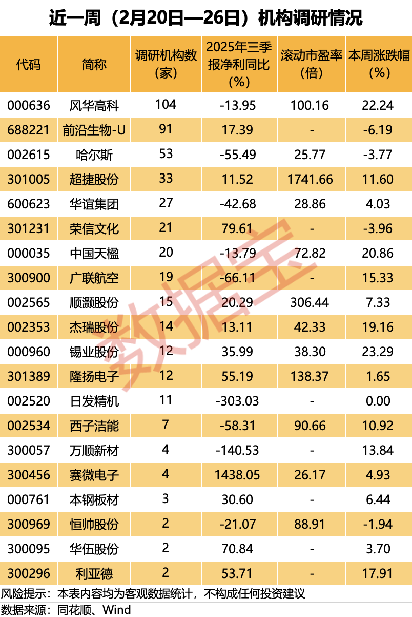 人民财讯3月1日电,近一周机构调研个股有20多只,风华高科调研机构数最多。