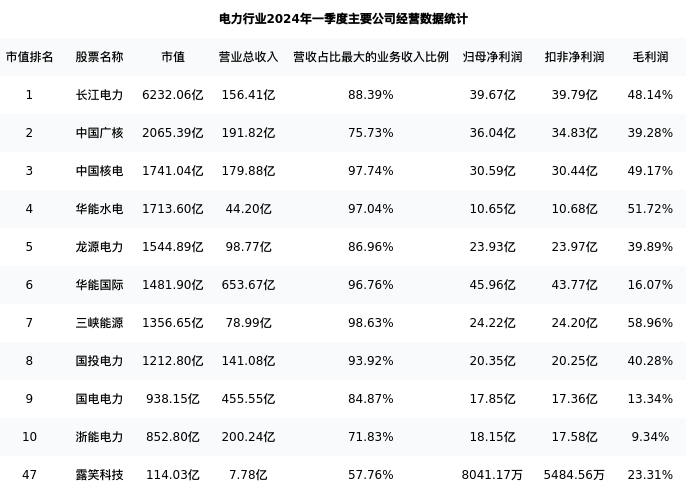 露笑科技最新报告期数据为一季度,下表汇总了电力行业内市值靠前的公司一季度主要经营数据