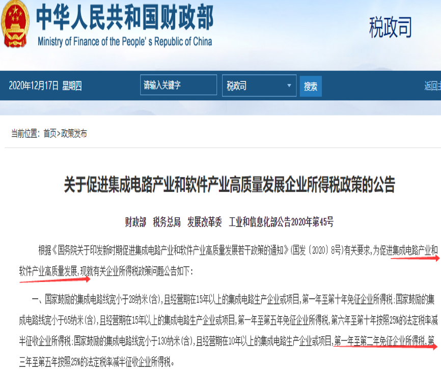 12月17日晚,财政部、税务总局、发展改革委、工信部四部门联合下发了《关于促进集成电路产业和软件产业高质量发展企业所得税政策的公告》。政策自2021年1月1日起执行。