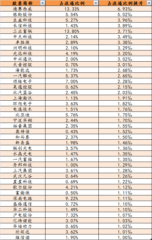 生益科技、长信科技、卓胜微、洲明科技、顺络电子、环旭电子、电连技术、和而泰、联创光电、水晶光电、丹邦科技、星星科技、歌尔股份、深南电路、富瀚微、华工科技、沪电股份、亿纬锂能、维信诺等北向资金持股比例提升超过1‰。
