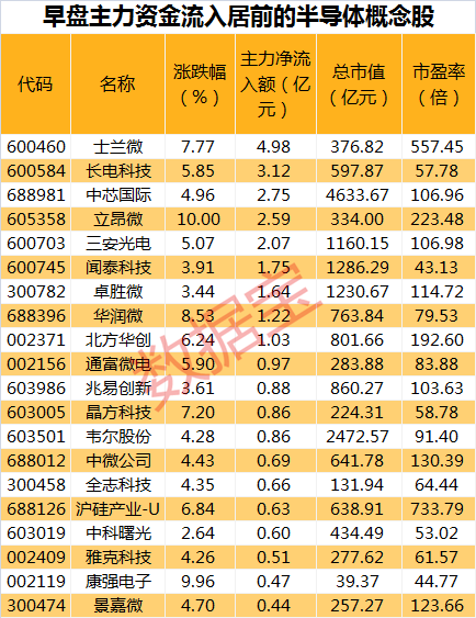 9只半导体概念股流入资金超亿元