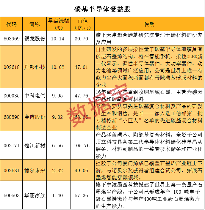 碳基半导体材料制备取得突破,早盘多只概念股涨停。