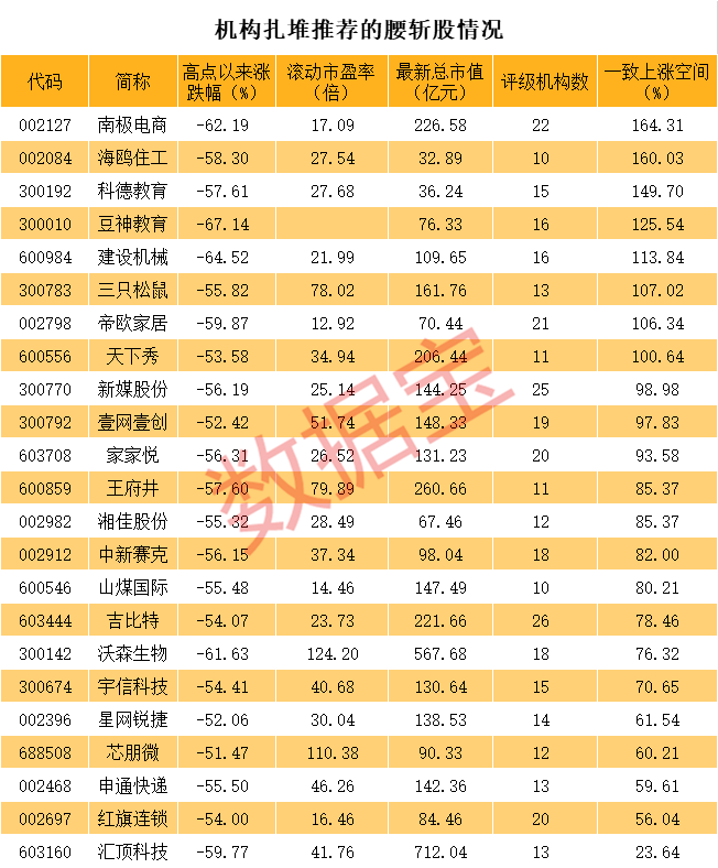 大幅调整之后,一些个股上涨空间变得更高。数据显示,南极电商、海鸥住工、科德教育等个股机构一致预测目标价较现价上涨空间均超过100%,新媒股份、壹网壹创、家家悦等个股上涨空间均超过50%。