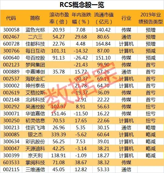 从北上资金持股看,RCS概念股中梦网集团的北上资金占流通股比例最大,持股超4%,掌阅科技、中嘉博创持股比例超2%。