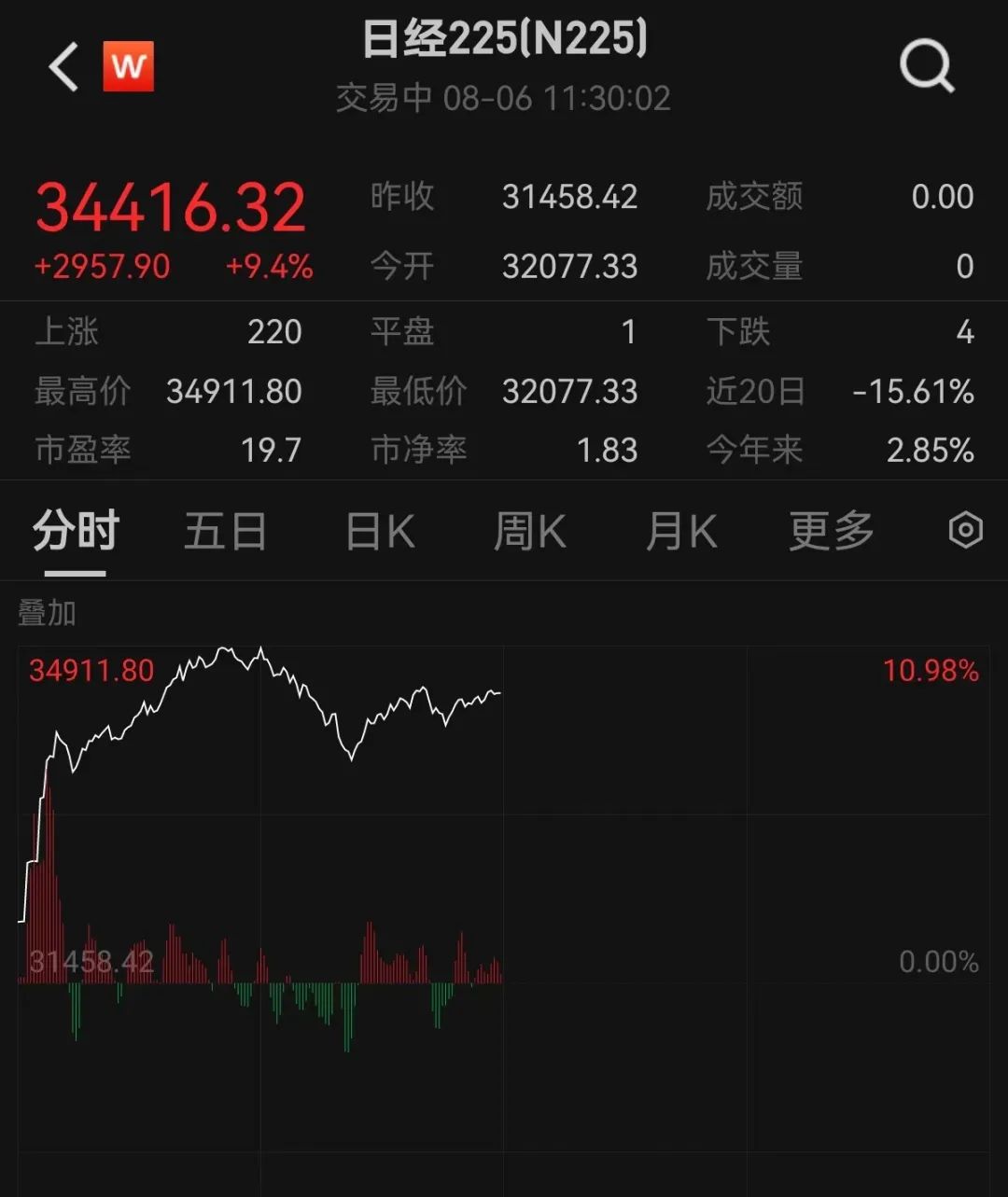 8月6日,经历昨日“惊魂一跳”之后,日韩股市开启暴力反弹。日本股市开盘走高,盘中日经225指数、东证指数均涨超10.8%。韩国综合指数、韩国KOSDAQ综合指数盘中分别涨超5.5%、6.8%。