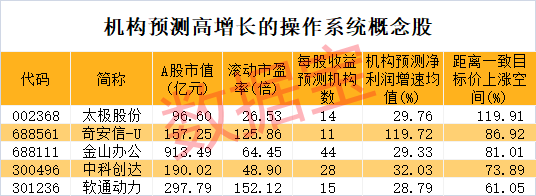 按照5家以上机构一致预测,今后3年净利润增速均有望超20%的公司有5家,分别是太极股份、奇安信-U、金山办公、中科创达、软通动力。以最新收盘价与机构一致预测目标价相比,太极股份上涨空间119.91%,居首位。其余4家公司股价上涨空间介于60%—90%之间。
