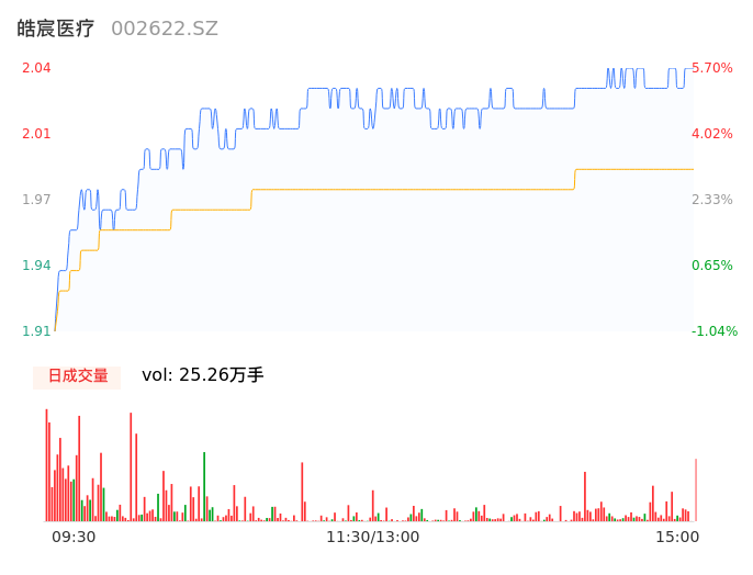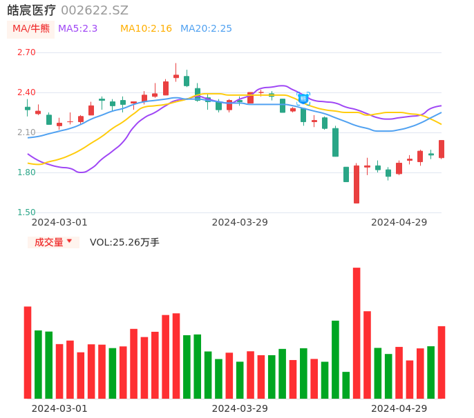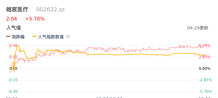 04月29日,皓宸医疗收报2.04,股价涨幅5.70%,成交金额5032.26万元,换手率3.01%。
