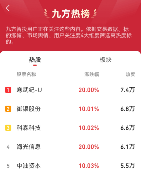 九方智投:寒武纪-U,御银股份、科森科技、海光信息、中油资本