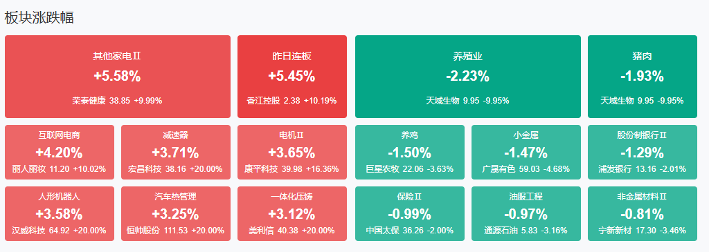 板块方面,机器人、互联网电商、物流等板块涨幅居前,猪肉、有色金属、影视院线等板块跌幅居前。截至收盘,沪指涨0.04%,深成指涨0.45%,创业板指涨0.68%。