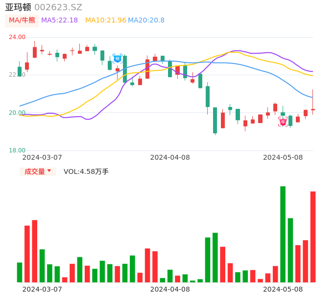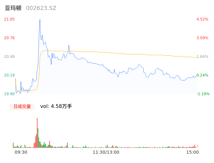 05月08日,亚玛顿收报20.18,股价涨幅0.20%,成交金额9362.62万元,换手率2.30%。