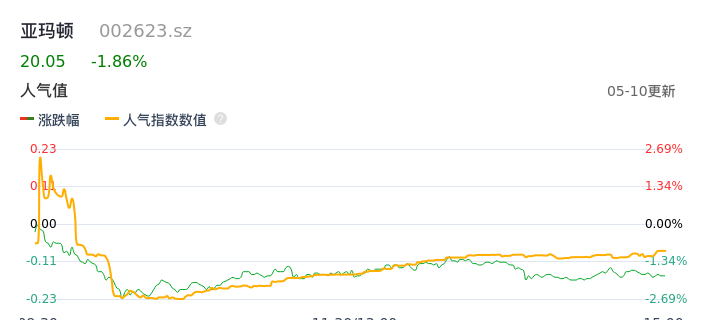 05月10日,亚玛顿收报20.05,股价涨幅-1.86%,成交金额4290.97万元,换手率1.07%。
