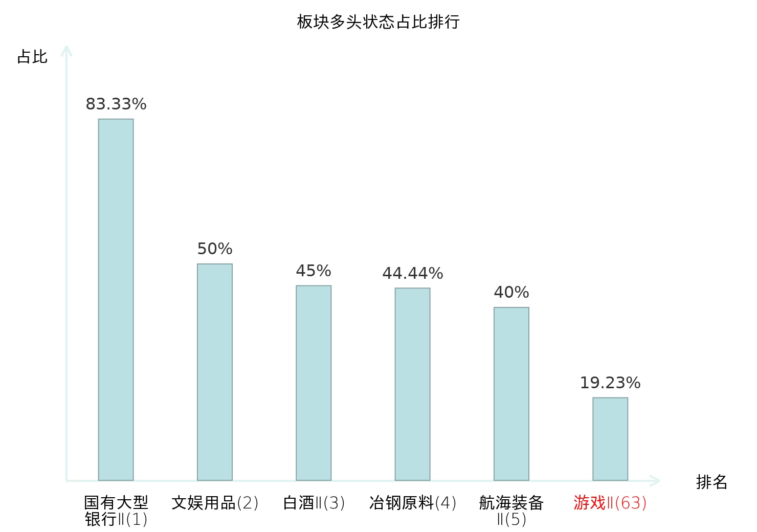 全市场所有行业板块中主力多头状态占比排名中,国有大型银行Ⅱ板块位居第一。其他家电Ⅱ板块名次提升最快,较昨日上升116位。