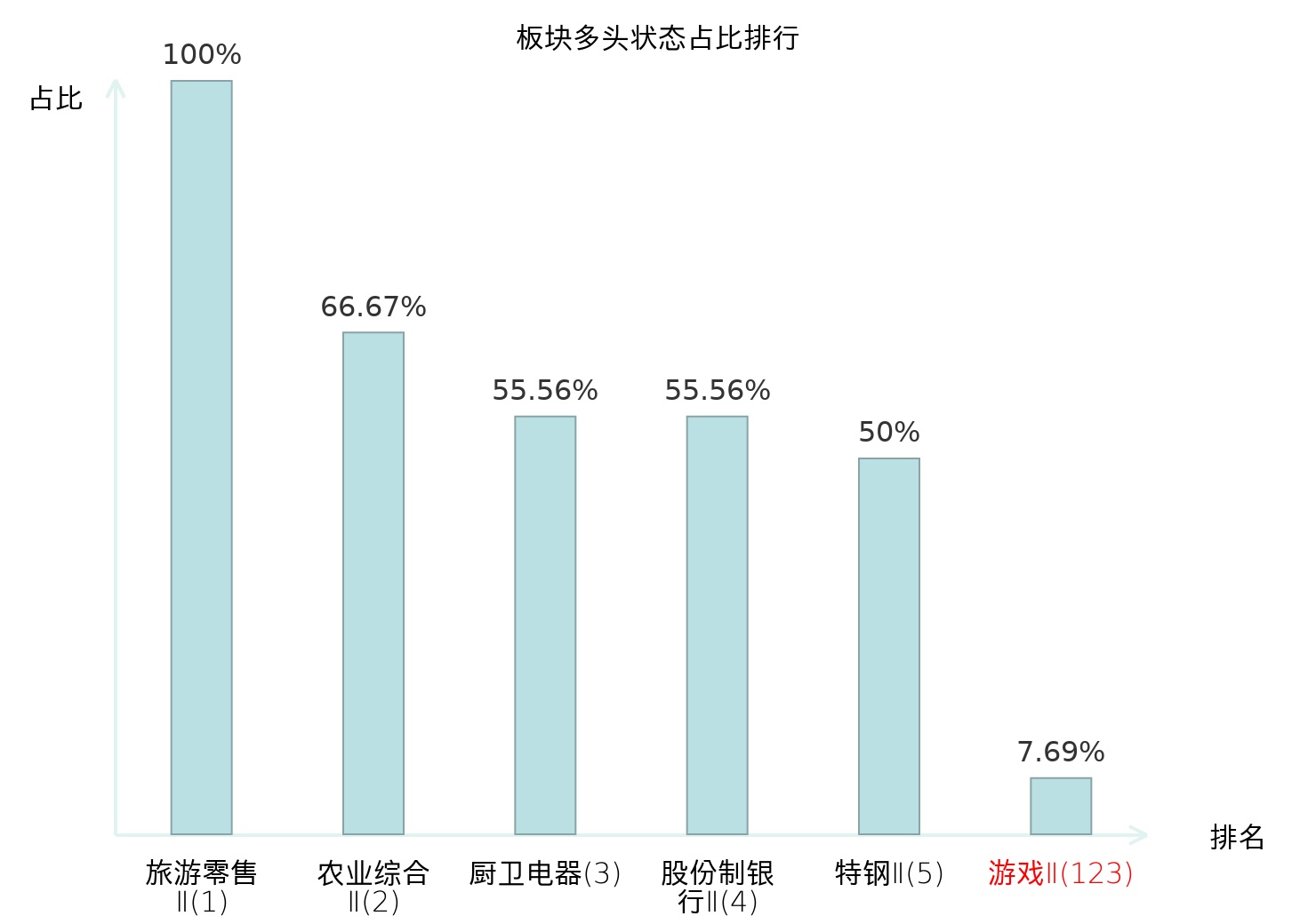 全市场所有行业板块中主力多头状态占比排名中,旅游零售Ⅱ板块位居第一。装修装饰Ⅱ板块名次提升最快,较昨日上升75位。