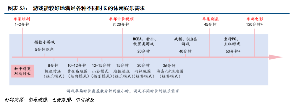 时长维度:无论是5分钟以内的碎片化时间,还是1个小时以上的深度娱乐需求,游戏都可以满足。凭借丰富的游戏品类和产品形态(小游戏、APP、主机游戏等),游戏基本上满足了用户不同时长的休闲娱乐需求。