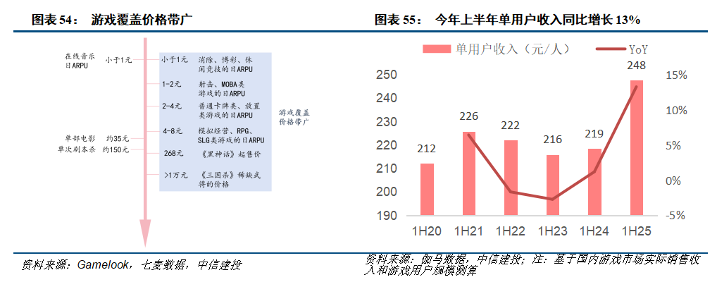 根据游戏工委数据测算,今年上半年单用户游戏收入同比增长13%。该行基于上半年国内游戏市场实际销售收入和用户规模测算,上半年单用户收入达248元,同比增长13%,绝对值和增速均创21年以来同期新高。该行认为增长的核心驱动力在于游戏的用户时长增加,用户愿意将更多休闲娱乐上的预算向游戏倾斜。