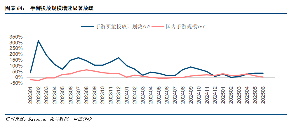 2)今年以来手游规模加速增长的同时,投放规模增速却显著放缓。上半年国内手游买量投放计划数同比增长22%,仅略高于同期手游市场规模增速17%,部分月份手游市场规模增速甚至高于买量投放规模增速,这与23-24年买量规模同比翻倍以上增长的情况已截然不同。反映传统买量的份额在下降。