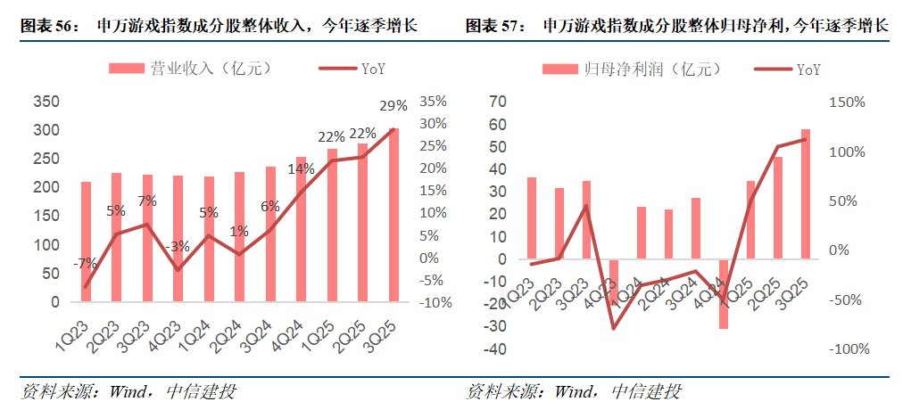 中信建投发布研报称,2025年游戏行业供需两旺驱动行业高景气,明年景气度与利润率或持续上行。随着供给端版号增长(2025年前10月同增23%)支撑后续流水,腾讯(00700)、网易(09999)、米哈游新游密集,中型厂商创新品类(如SLG+消除、创意棋牌、新兴女性向等)潜力足渠道议价弱化+AI买量提效,利润率持续上行。此外,从各游戏公司在财报中描述的AI进展看,AI已广泛应用于游戏研发与运营全流程,有望赋能游戏研发与运营效率提升。