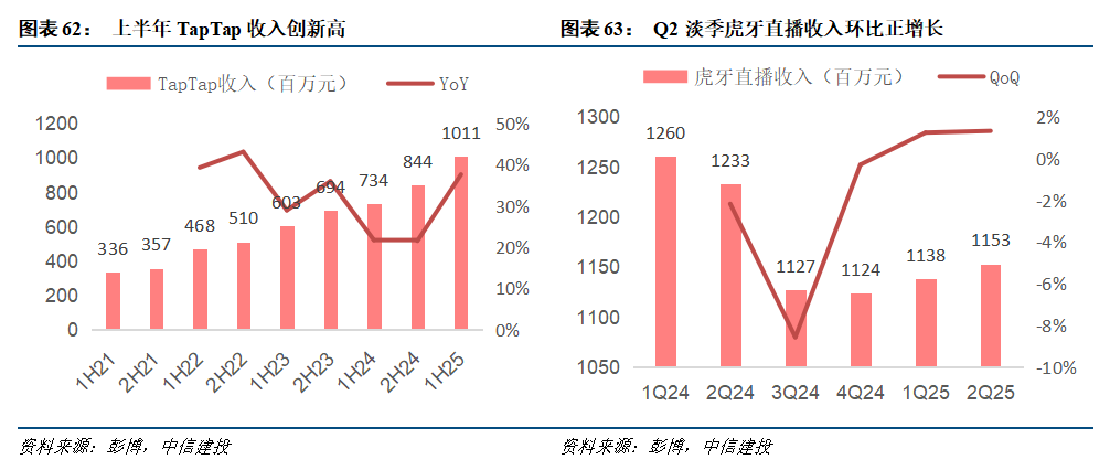 1)今年以来以TapTap、虎牙为代表的游戏社区业绩超预期,反映游戏的营销预算更多地向游戏社区平台倾斜。TapTap信息流广告和虎牙直播投放的ROI高于传统买量,一是因为这两个平台聚集大量游戏重度用户,能更精准匹配游戏目标客群,减少无效投放;二是社区讨论、直播等强互动场景,更易激发用户下载,提高转化率。上半年TapTap收入10.1亿元创新高,同比增长38%,增速也创23年以来新高;二季度虎牙直播收入11.5亿元,在淡季仍实现环比正增长。