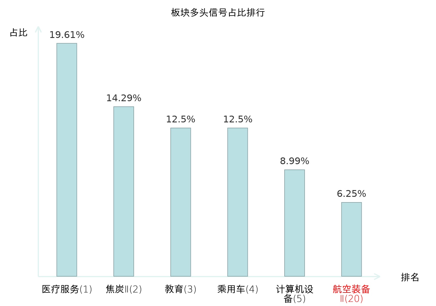 全市场所有行业板块中主力多头信号占比排名中,医疗服务板块位居第一。焦炭Ⅱ板块名次提升最快,较昨日上升119位。