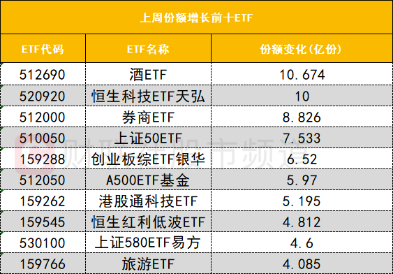 在上周份额增长前十ETF中,酒ETF(512690)上周份额增长10.674亿份位居首位;恒生科技ETF天弘(520920)上周份额增长10亿份位居次席。