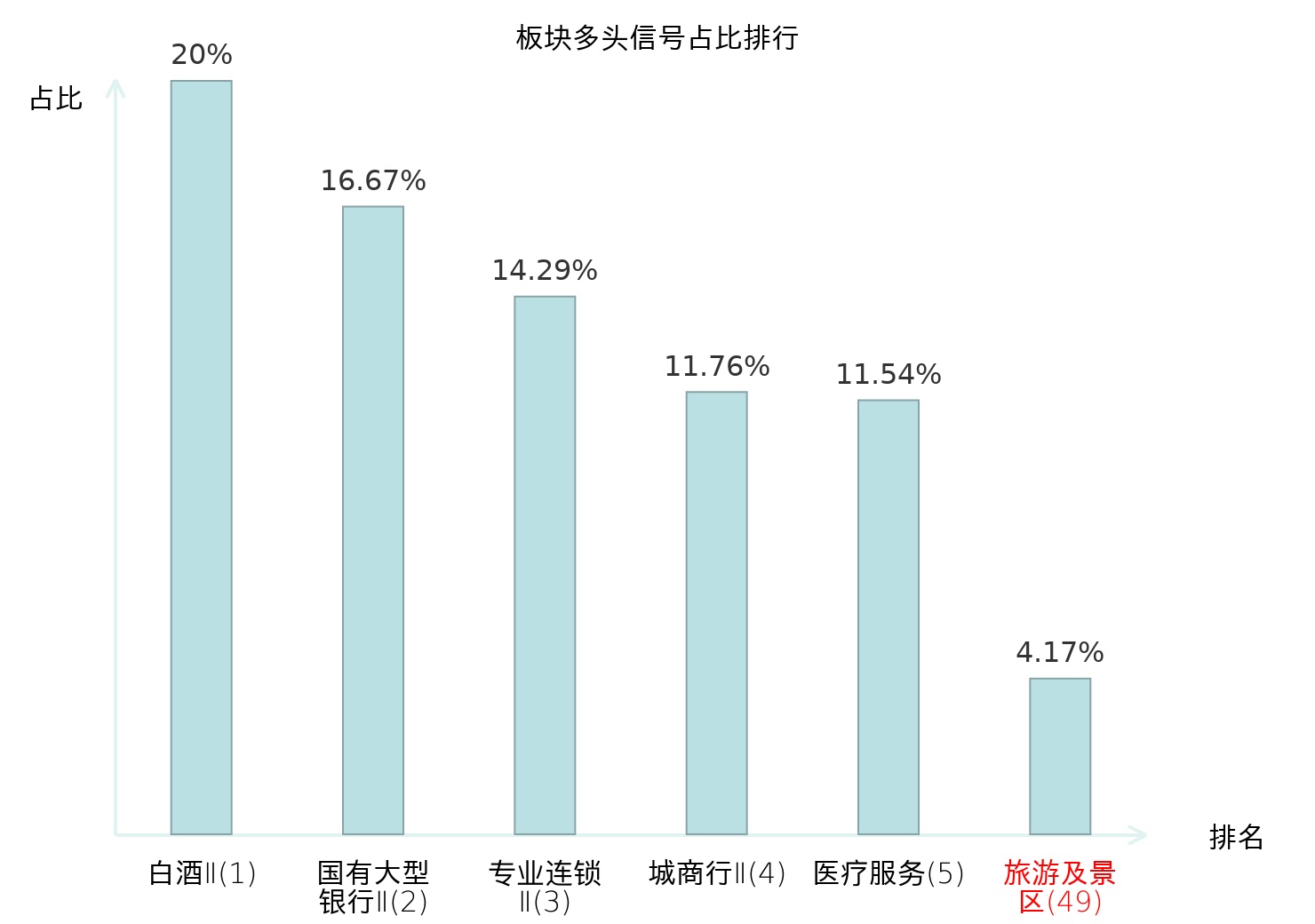 全市场所有行业板块中主力多头信号占比排名中,白酒Ⅱ板块位居第一。国有大型银行Ⅱ板块名次提升最快,较昨日上升121位。