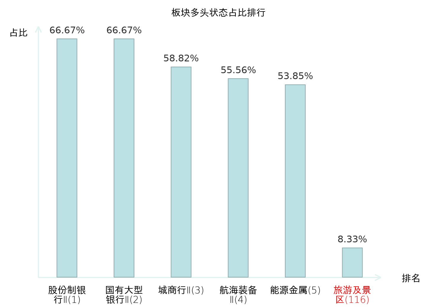 全市场所有行业板块中主力多头状态占比排名中,股份制银行Ⅱ板块位居第一。渔业板块名次提升最快,较昨日上升61位。