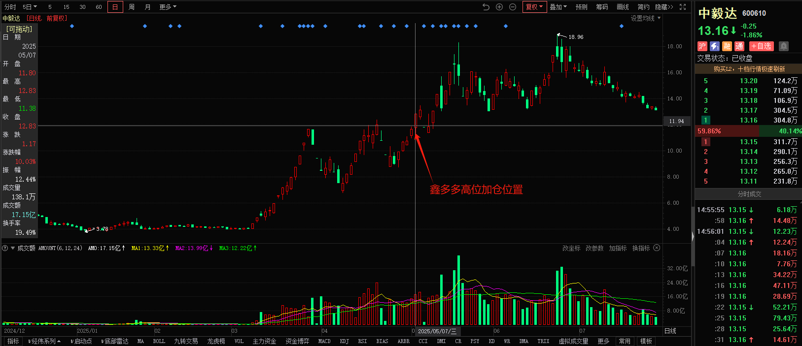 复盘最近一年交易,相对来说人气比较高的就是中毅达,从5.7日开始高位买入7644万,再次参与之后后续开始不断往上,后续走出凌厉走势,鑫多多继续加仓锁仓,目前他仍然在说此股逻辑,只是市场已经不再认可,因此这种还是要辩证看待,不排除他利用自身影响力去反向做,留一分清醒。