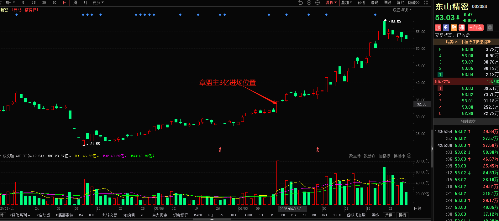 最近章盟主可以说是率先发现机构趋势赚钱效应的游资之一,从今年东山精密6.16日的买入近3亿之后就再也没有出现在龙虎榜上,随后东山精密开启将近翻倍之路,盟主不愧是盟主,对市场的嗅觉相当敏锐,后续可以反推出如果他出现离场东山精密或者大幅度减仓后可以看到阶段顶部的特征。