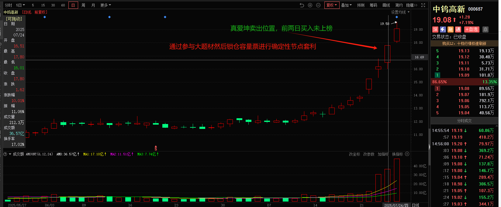 近期最强操作为中钨高新的交易历程,从7.24日的卖榜来看,其卖出中钨高新2.2亿,由于前两日没有榜单,其大概率交易模式为半路或者打板,因此大概率是在7.22日买入后成功迎来主升浪,因此当其大手笔介入后可以看看板块内部题材持续性。