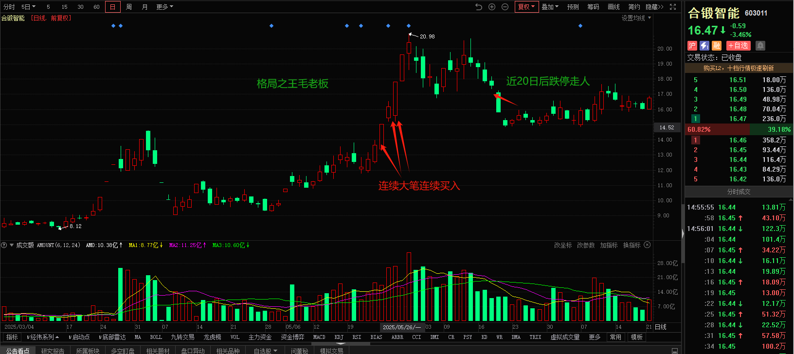 看交易手法,25.5.26日到5.29日连续买入核电股合锻智能,并且一直加仓买入超1个亿,随后开始漫长的锁仓,一直到6月19日近20天的持仓跌停之后,才跌停全部走人,可见格局之大令人咂舌,一般他出现大手笔的买单之后,大概率不会一日游。
