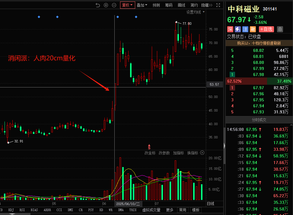消闲派近期相对操作较好的为6.10日中科磁业,主要买在稀土永磁板块启动之时,伴随着后续题材催化反复活跃,中科磁业继续往上走出20%的收益,只不过它的交易手法偏向于量化一日游,对于后续参考意义不大,还是以上榜个股判断行情级别即可。