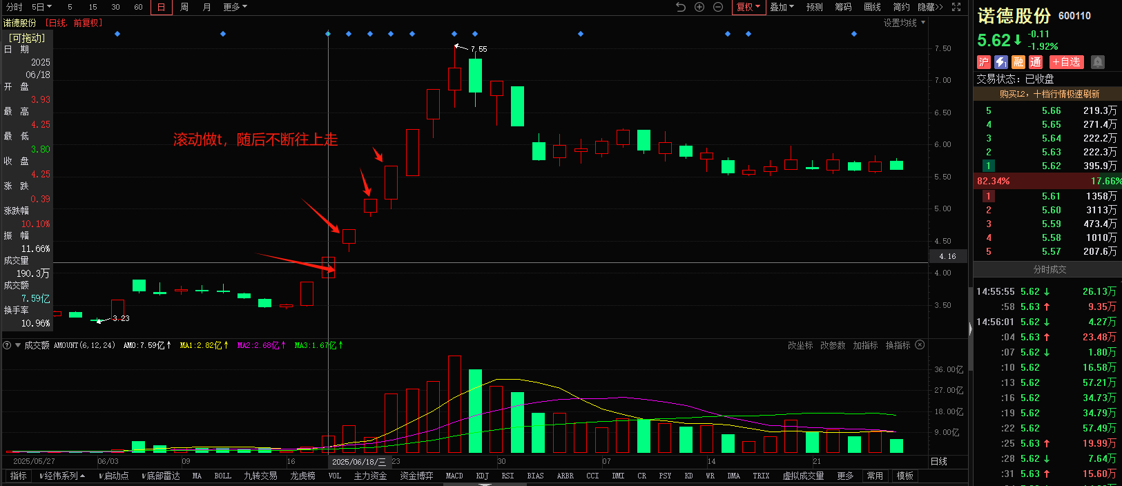 以近期最优战役诺德股份为例,从6.18日买入1000w随后次日卖出,6.20日再次买入3000w,随后开始滚动做t,直到6.26日后1亿卖出,新闸路再次像我们展示高位做t滚动锁仓的威力,后续其高位滚动可以关注这条逻辑的延伸与发散。