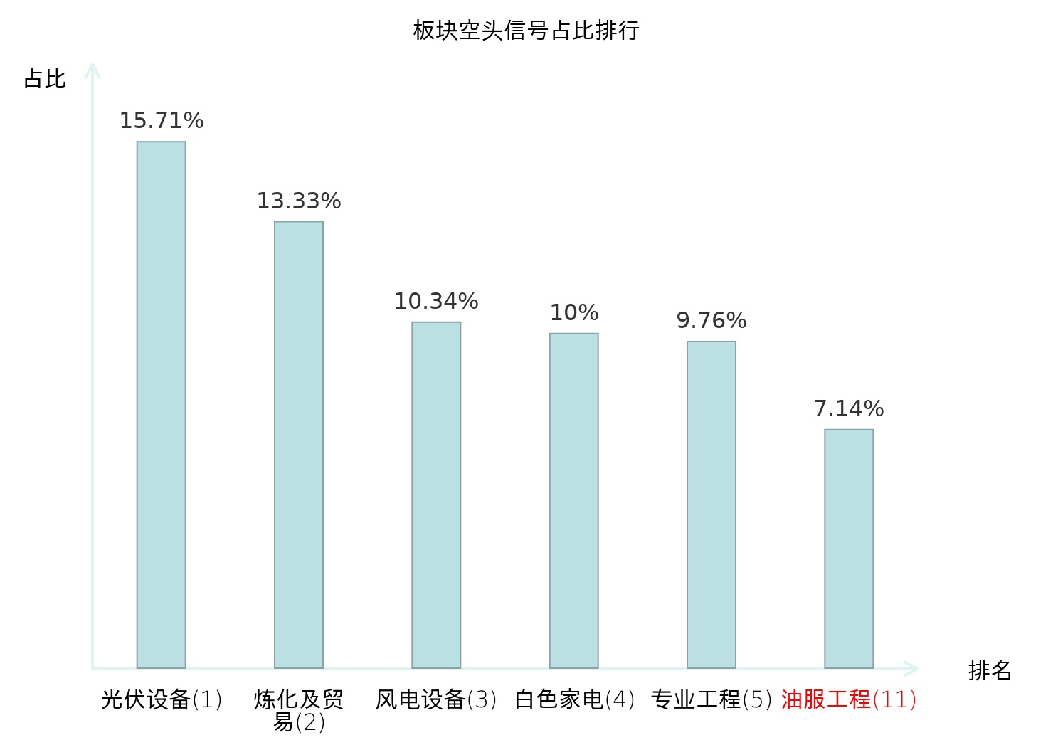 全市场所有行业板块中主力空头信号占比排名中,光伏设备板块位居第一。光伏设备板块名次提升最快,较昨日上升125位。