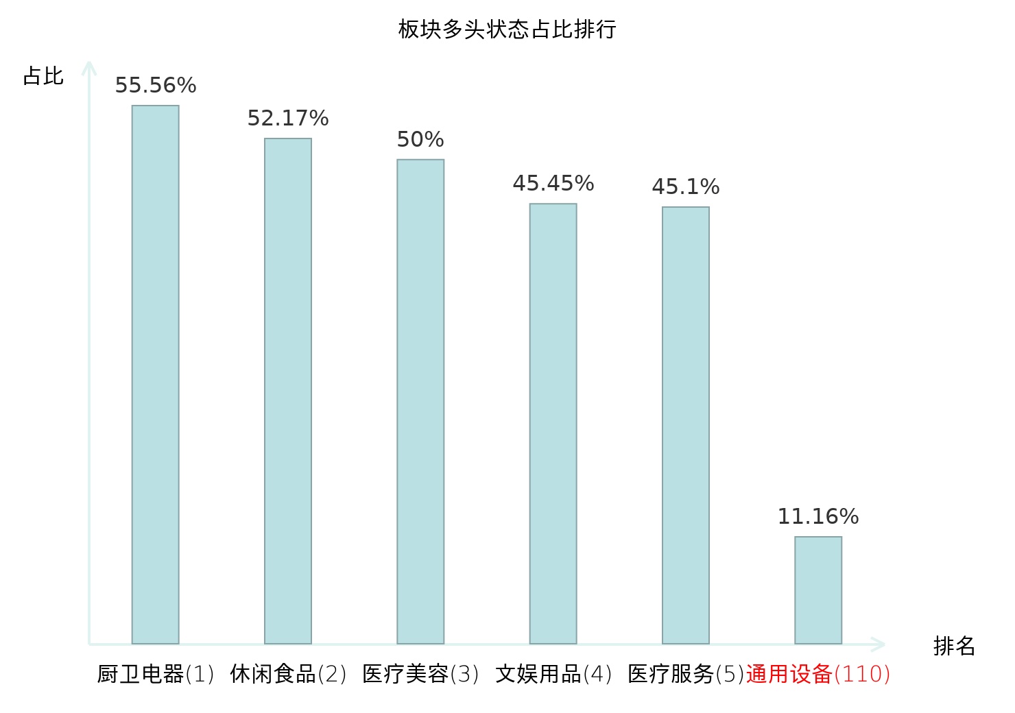 全市场所有行业板块中主力多头状态占比排名中,厨卫电器板块位居第一。林业Ⅱ板块名次提升最快,较昨日上升87位。