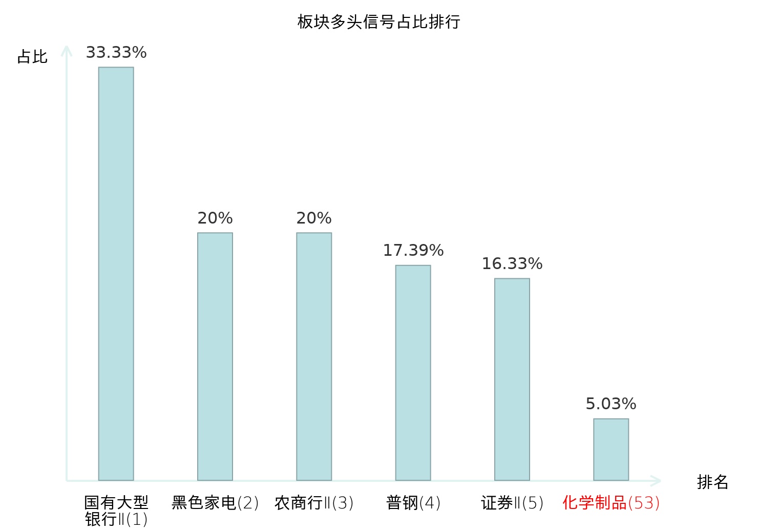 全市场所有行业板块中主力多头信号占比排名中,国有大型银行Ⅱ板块位居第一。国有大型银行Ⅱ板块名次提升最快,较昨日上升123位。