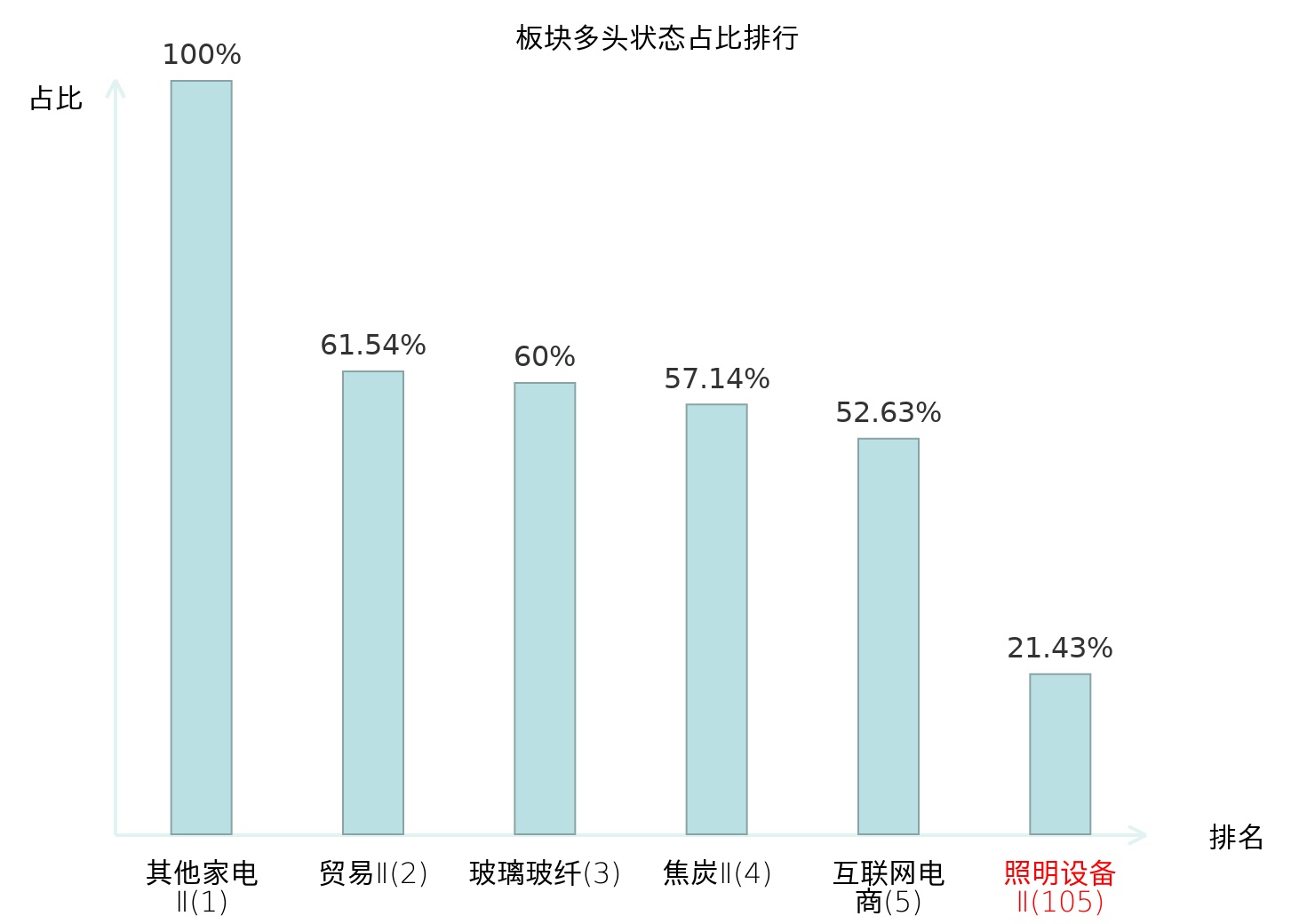 全市场所有行业板块中主力多头状态占比排名中,其他家电Ⅱ板块位居第一。教育板块名次提升最快,较昨日上升50位。