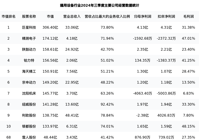 雪人股份最新报告期数据为三季度,下表汇总了通用设备行业内市值靠前的公司三季度主要经营数据