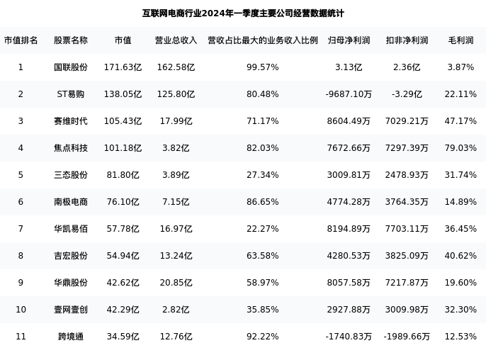 跨境通最新报告期数据为一季度,下表汇总了互联网电商行业内市值靠前的公司一季度主要经营数据