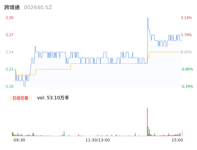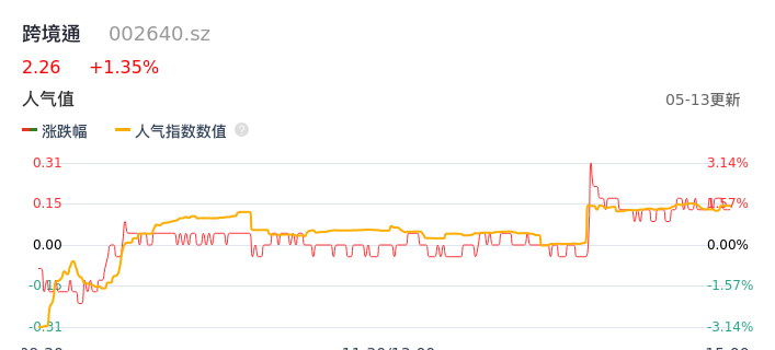 05月13日,跨境通收报2.26,股价涨幅1.35%,成交金额1.19亿元,换手率3.73%。