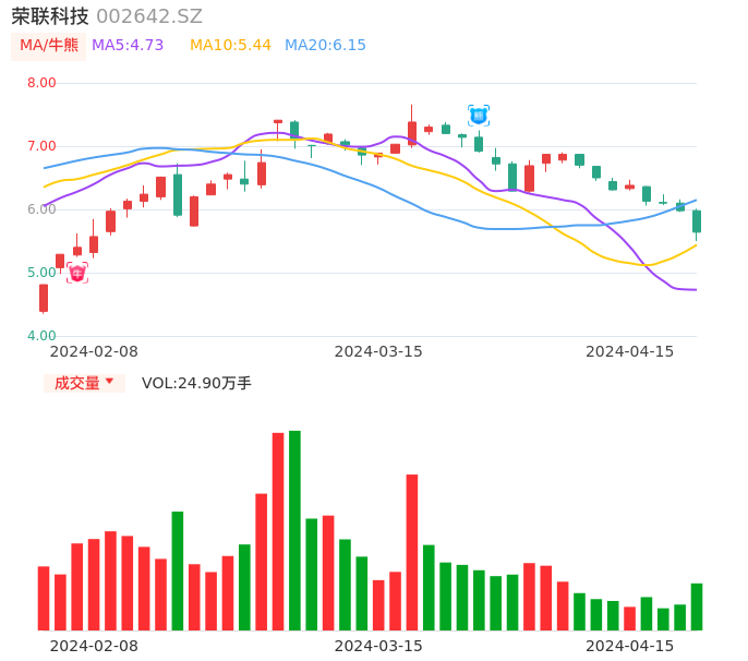 04月15日,荣联科技收报5.64,股价涨幅-5.69%,成交金额1.41亿元,换手率4.12%。