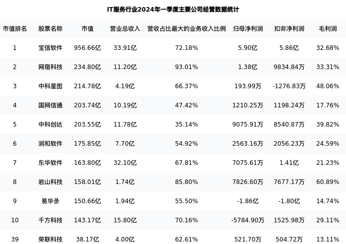 荣联科技最新报告期数据为一季度,下表汇总了IT服务行业内市值靠前的公司一季度主要经营数据