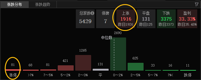 上涨个股不足2000家,涨停81只,有不少。跌停11只,不过大多还是ST,个股中位数有所下跌,赚钱效应集中在机器人、智能汽车及零部件上。