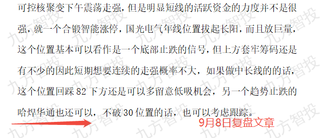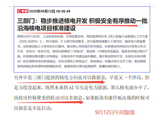 再有就是下午核电,可控核聚变方向2点过后一波脉冲的拉升,不过也是局部行情,还是南风股份20厘米涨停,融发核电、哈焊华通冲高大涨(这两只股的分时走势很雷同)。我们在9月8日,以及上周五(12日)的复盘文章中都讲到过关注核电的脉冲机会。