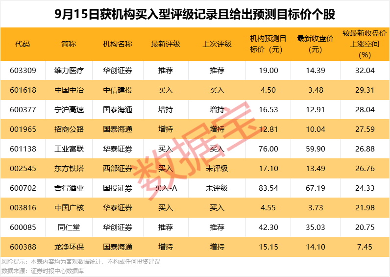 其中,维力医疗上涨空间最高,华创证券预计公司目标价为19元,上涨空间达32.04%;上涨空间较高的个股还有中国中冶、宁沪高速等,上涨空间分别为29.31%、28.04%。