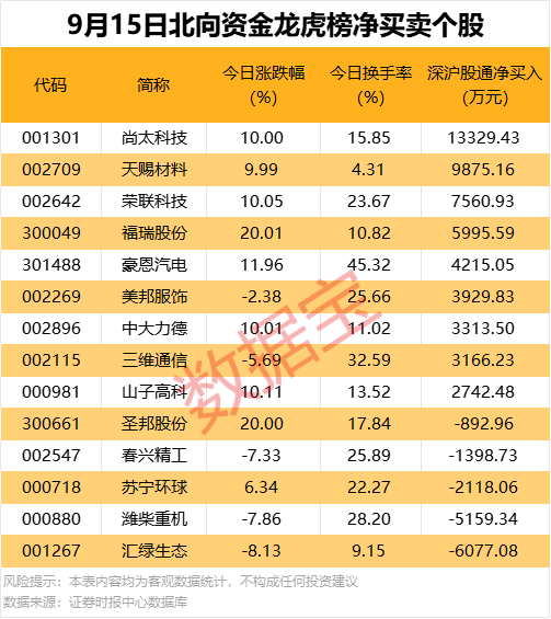 今日龙虎榜现身个股中,9股获北向资金净买入。净买入居首的是尚太科技,金额为1.33亿元;天赐材料、荣联科技、福瑞股份分别获净买入9875.16万元、7560.93万元、5995.59万元。