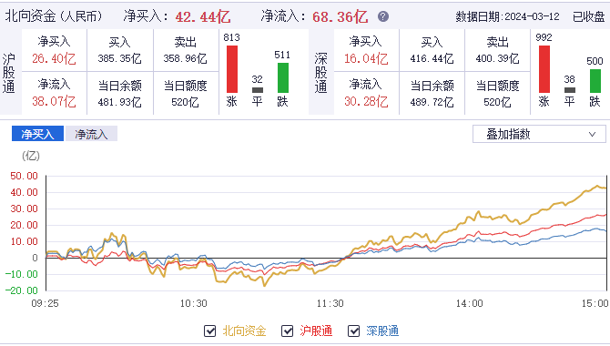盘面上,飞行汽车、中药、房地产、白酒等板块涨幅居前,煤炭、电力、有色金属、液冷服务器等板块跌幅居前。同时,沪深两市总成交额11454亿,较上个交易日放量1395亿,依旧是万亿水平。而北上资金,则在今日净买入42.44亿,流入幅度较昨日有所减缓。