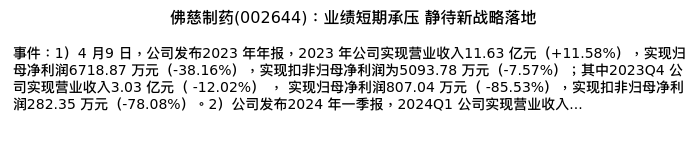 值得注意的是:2024年04月长城证券的刘鹏/蔡航分析师,首次发布关于佛慈制药的研究报告,标题为:佛慈制药(002644):业绩短期承压 静待新战略落地。