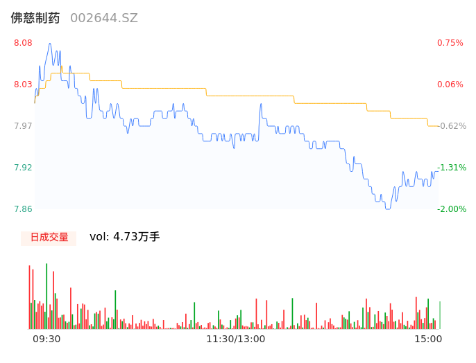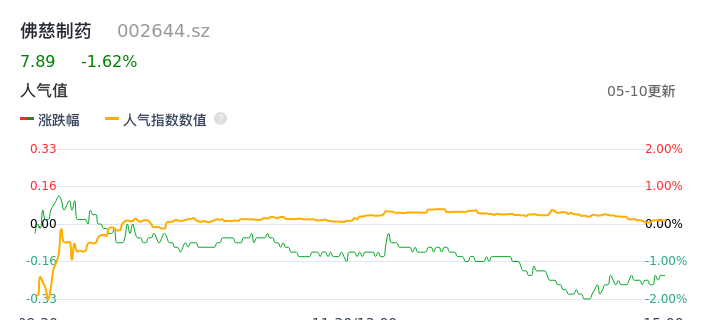 05月10日,佛慈制药收报7.89,股价涨幅-1.62%,成交金额3769.11万元,换手率0.93%。