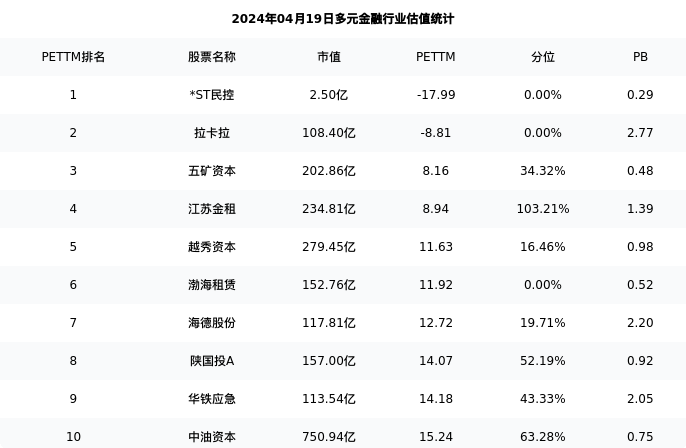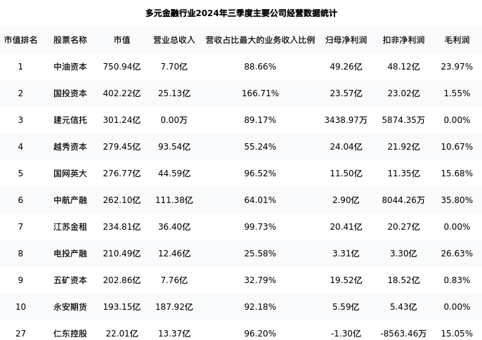 仁东控股最新报告期数据为三季度,下表汇总了多元金融行业内市值靠前的公司三季度主要经营数据